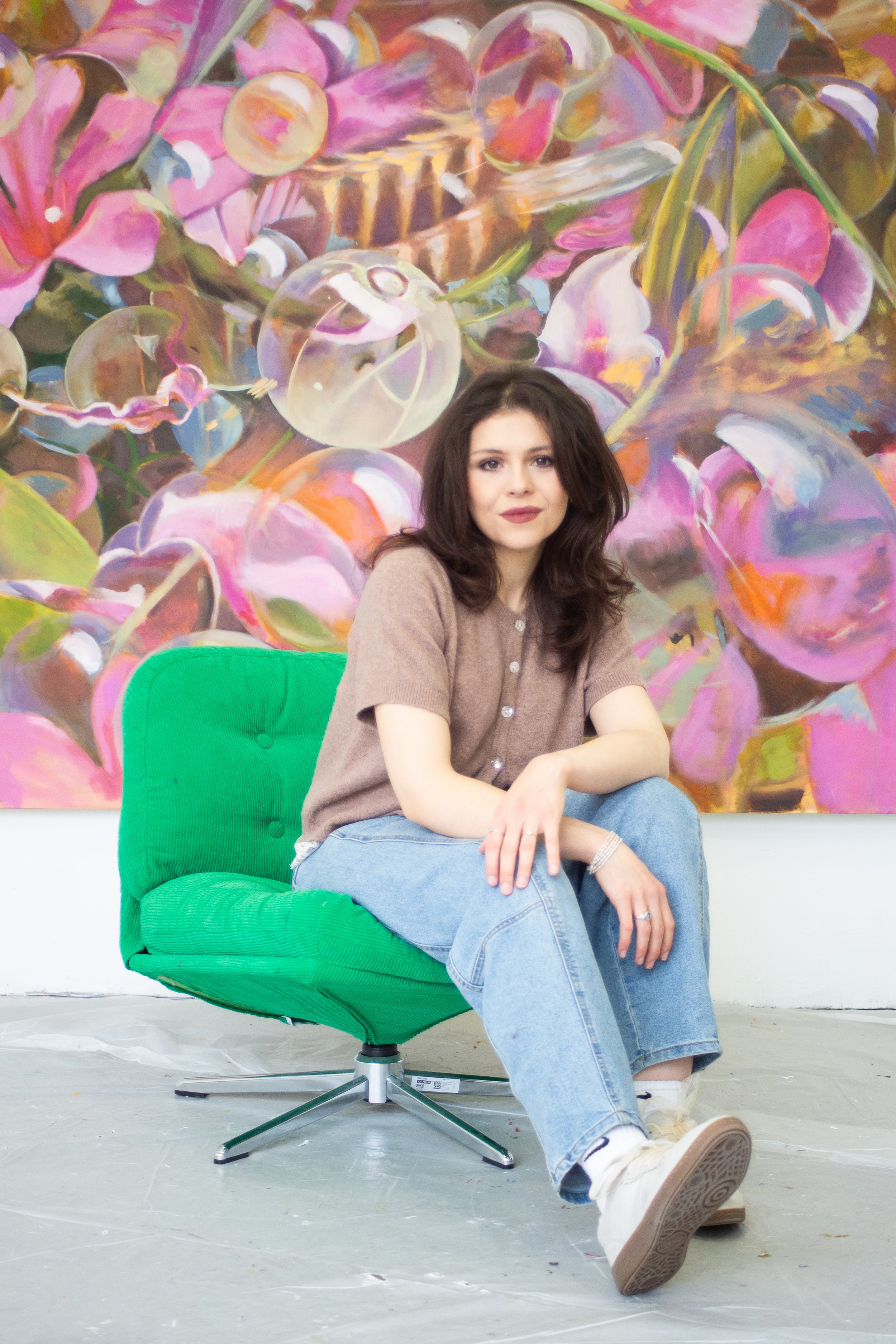 Alexandra Collins (b. 2001) Is an oil painter born and raised in Metro Detroit. She received her Bachelors of Fine Art at the University of Michigan Penny W. Stamps School of Art & Design in 2024, and will graduate with her Masters of Fine Art in Painting at Cranbrook Academy of Art in May 2026. Collins approaches painting as a space of synthesis, where organic and inorganic forms coalesce into complex systems of information. These detailed oil paintings surround plant life such as fruit, flowers, and other natural subjects like water and minerals amalgamating with inorganic forms such as plastic and glass, inciting themes of abundance, multiplicity, energy, rush, chaos and organization, divine timing, movement, freedom, breath, and life. She is inspired by movement of the eye, especially visual behavior during instances of viewing of translucent materials and organic forms. Collins is motivated by creating work that invites healing through vibrant color and streaks of light that move across the canvas.